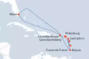 Itinerario : Miami, Charlotte Amalie, Philipsburg, Santo Barthélemy, Fort-de-France, Pointe a pitre (Guadalupe), Saint John's, Bequia, Miami