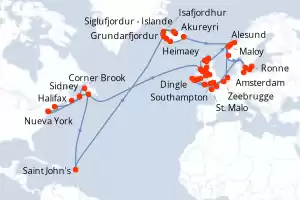 Itinerario : Nueva York, Halifax, Sidney, Saint Pierre y Miquelon, Saint John's, Grundarfjordur, Akureyri, Siglufjordur - Islande, Isafjordhur, Reykjavik, Heimaey, Djupivogur, Alesund, Maloy, Haugesund, Amsterdam, Zeebrugge, Southampton, Portland, Falmouth, Dingle, Bantry, Cork, Waterford, Holyhead, Liverpool, Dun Laoghaire, Belfast, Douglas, Greencastle, Ullapool, Scrabster, Invergordon, Kristiansand, Copenhague, Warnemunde, Ronne, Karlskrona, Southampton, Le Havre, St. Malo, Falmouth, Cork, Holyhead, Glasgow, Killybegs, Corner Brook, Sidney, Boston, Nueva York