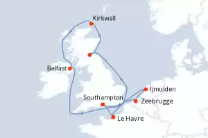 Itinerario : Southampton, Le Havre, Edimbourg, Kirkwall, Belfast, Dun Laoghaire, Ijmuiden, Zeebrugge, Southampton