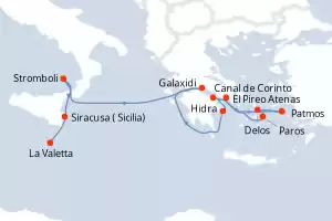 Itinerario : El Pireo Atenas, Patmos, Delos, Paros, Canal de Corinto, Hidra, Galaxidi, , Stromboli, Siracusa ( Sicilia), La Valetta