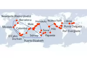 Itinerario : Barcelona, Lisboa, Punta Delgada, Praia da vitoria, Nueva York, Port Everglade, Half Moon Cay, Cristobal, Puntarenas, Puerto Quetzal, Puerto Vallarta, Cabo san Lucas, San Diego, Los Angeles, San Francisco, Honolulu, Hilo, Papeete, Suva, Lifou, Nouméa, Sidney, Newcastle (UK), Cairns, Rabaul, Tokyo, Kobe, Nagasaki, Pusan, Keelung, Hong Kong, Nha Trang, Phu My, Ko Samui, Singapur, Port Kelang, Penang, Colombo, Male, Port Louis, Durban, Puerto Elizabeth, Le Cap , Walvis Bay, Mindelo, Las Palmas, Barcelona