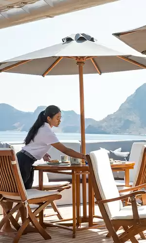 El servicio a bordo es de una atención inigualable, anticipando los mínimos deseos de los huéspedes. Espacios de vida generosos, como cubiertas de observación al aire libre, salas de proyección privadas y bibliotecas, contribuyen a crear un ambiente de lujo relajado, propicio para el intercambio y la contemplación.