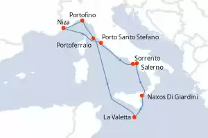 Itinerario : Niza, Bastia, Portoferraio, Porto Santo Stefano, Salerno, Naxos Di Giardini, La Valetta, Trapani, Livorno, Portofino, Niza, Bastia, Portoferraio, Porto Santo Stefano, Salerno, Naxos Di Giardini, La Valetta, Trapani, Livorno, Portofino, Niza