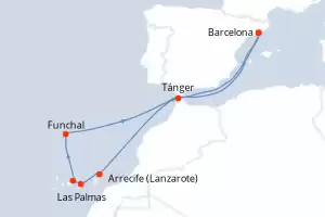 Itinerario : Barcelona, Arrecife (Lanzarote), Las Palmas, Santa Cruz de Tenerife, Funchal, Tánger, Barcelona