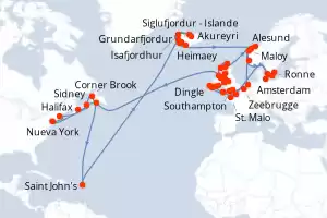 Itinerario : Nueva York, Halifax, Sidney, Saint Pierre y Miquelon, Saint John's, Grundarfjordur, Akureyri, Siglufjordur - Islande, Isafjordhur, Reykjavik, Heimaey, Djupivogur, Alesund, Maloy, Haugesund, Amsterdam, Zeebrugge, Southampton, Portland, Falmouth, Dingle, Bantry, Cork, Waterford, Holyhead, Liverpool, Dun Laoghaire, Belfast, Douglas, Greencastle, Portree, Scrabster, Invergordon, Kristiansand, Copenhague, Warnemunde, Ronne, Karlskrona, Southampton, Le Havre, St. Malo, Falmouth, Cork, Holyhead, Glasgow, Killybegs, Corner Brook, Sidney, Boston, Nueva York