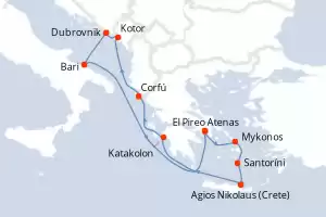 Itinerario : El Pireo Atenas, Mykonos, Santoríni, Agios Nikolaus (Crete), Katakolon, Corfú, Kotor, Dubrovnik, Bari, El Pireo Atenas