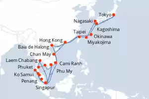 Itinerario : Tokyo, Kagoshima, Okinawa, Hong Kong, Chan May, Cami Ranh, Phu My, Singapur, Laem Chabang, Ko Samui, Sihanoukville, Phu My, Penang, Phuket, Langkawi, Kuala Lumpur, Singapur, Cami Ranh, Baia de Halong, Hong Kong, Taipei, Miyakojima, Nagasaki, Tokyo