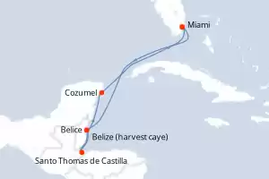 Itinerario : Miami, Cozumel, Santo Thomas de Castilla, Belize (harvest caye), Roatan, Falmouth, Gran Caiman, Miami
