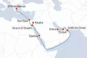 Itinerario : El Pireo Atenas, Port Said, Sharm El Sheikh, Aqaba, Djedda, Golfo de Oman, Dubai, Doha
