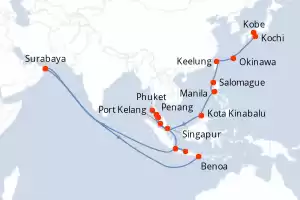Itinerario : Kobe, Kochi, Okinawa, Keelung, Salomague, Manila, Kota Kinabalu, Singapur, Port Kelang, Penang, Phuket, Langkawi, Jakarta, Semarang, Surabaya, Benoa